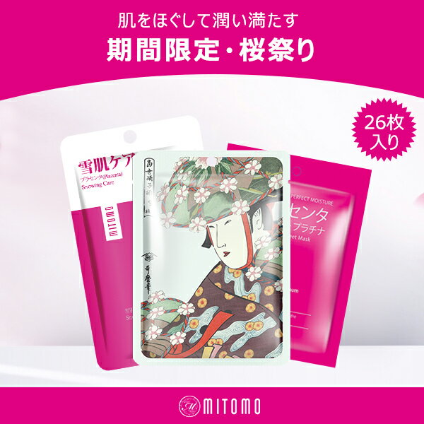 【JSM-TKJP00004-A-2】期間限定・桜祭り【Mitomo 桜・アロエマスク1箱+プラセンタ ・プラチナマスク1箱+プラセンタスノーケアマスク1箱】/マスクパック3種類セット(26枚)/日本製